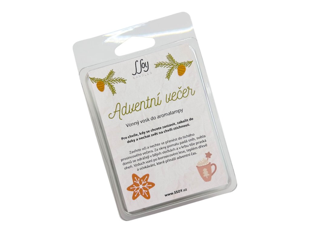 Vůně Adventní večer spojuje sladkost benzoinu s jemností bílého javoru a křehkým bramboříkem. V pozadí se rozvíjí cedr, pačuli a lehké tóny potpourri, které vytvářejí hřejivý, klidný základ. Je to vůně, která zahřeje, i když venku mrzne, a promění každý kout vašeho domova v oázu pohody.