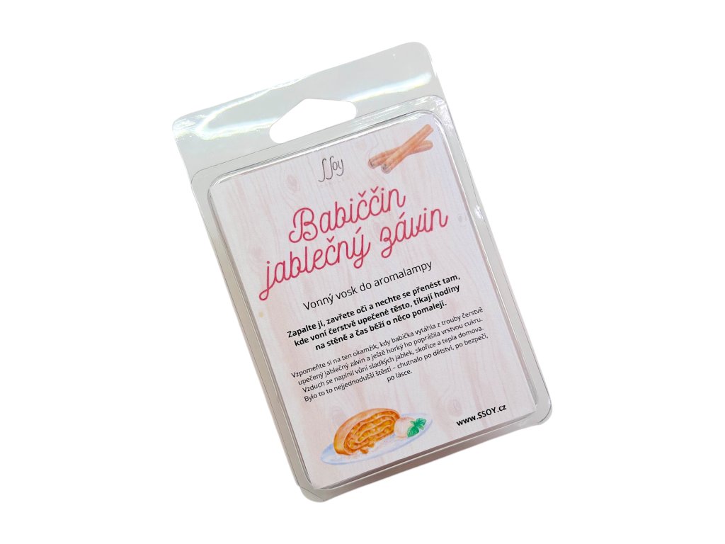 Vůně Babiččin jablečný závin otevírá příběh svými šťavnatými tóny karmínového jablka, mandarinky a citronu. V srdci se rozvoní šumivá skořice, hřebíček a smetanový muškátový oříšek, které se jemně prolínají s novým kořením. V základu se pak usazuje badyán, vanilkový lusk a jedlová jehlice – teplá, hladká kombinace, která zabalí celý prostor do neodolatelné, domácí pohody.